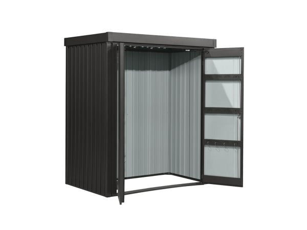 Produktinformation, , Wandhöhe 173 cm, Grundmass (B x T) : 122 x 92 cm, Materialstärke: Tür 0.6 mm, Dach-und Wandstärke 0.4 mm , Rahmen aus verzinktem und pulverbeschichtetem Stahl 1 mm, Wasserdichtes Flachdach , , Glatte Tür mit niedrigem Einstieg, welche mit 2 Aluminiumstreifen je Flügel verziert ist, , Doppel-Flügeltür mit 4 Werkzeuggerätehaken je Flügelseite , , Türen abschliessbar mit 2 Schlüsseln, , Hohe Stabilität durch Gaszylinder, Dach inkl. Regenrinne sowie 2 Wasserauslässen, , Schneelast 150 kg/qm, , Inkl. Bodenbefestigungsmaterial für eine bessere Stabilität