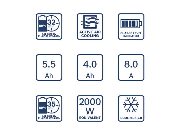 Der 5,5-Ah-Akku aus der Bosch ProCORE18V-Reihe liefert beeindruckende Leistung bis zu 1.800 Watt und zeichnet sich durch die COOLPACK 2.0-Technologie aus. Diese gewährleistet überlegene Wärmeableitung und somit eine bis zu 135 % längere Lebensdauer im Vergleich zu Standardakkus. Das Schnellladegerät GAL 1880 ermöglicht zudem das Aufladen der 4,0-Ah- und 5,5-Ah-Akkus in nur 32 bzw. 35 Minuten auf 80 %, und ist kompatibel mit allen 18-Volt-Akkus für eine schnelle Aufladung., , Der ProCORE18V 4.0Ah eignet sich perfekt für Arbeiten über Kopf, während der ProCORE18V 5.5Ah-Akku speziell für anspruchsvollere Aufgaben mit BITURBO-Elektrowerkzeugen entwickelt wurde