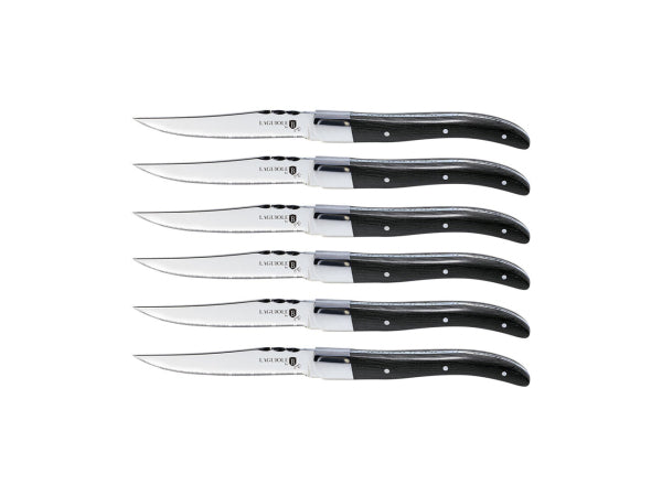 Erfreue dich an exquisitem Genuss mit dem Berlinger Haus 6-teiligen Messerset aus der Laguiole by Berlinger Haus Kollektion. Diese Steakmesser sind nicht nur hochwertig, sondern auch elegant gestaltet., , Mit ihren schwarzen Holzgriffen bieten diese Steakmesser eine traditionelle und klassisch schlanke Optik, die zu jedem Tischsetting passt. Die Klingen bestehen aus rostfreiem Stahl und sind 12,5 cm lang, was sie ideal für das Schneiden von Steaks und anderen Fleischgerichten macht., , Das Set wird in einer stilvollen Holzbox geliefert und eignet sich daher auch hervorragend als Geschenk für besondere Anlässe. Diese Messer zeichnen sich durch hervorragende Qualität und Handwerkskunst aus und werden sicherlich Ihre Essenserlebnisse bereichern., , Produktinformation, Material: rostfreier Stahl, Mit schwarzem Holzgriff, Grösse: 12,5 cm, Ausgezeichnete Qualität, Traditionell, Klassisch schlankes Design