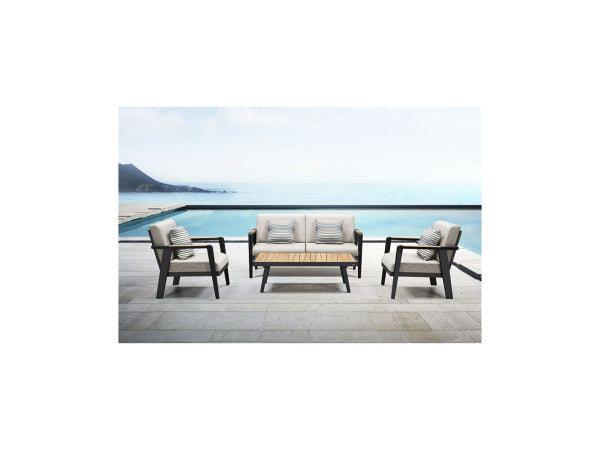 Entdecke mit der Emoti Gartenlounge die perfekte Symbiose aus Eleganz und Funktionalität für jeden Garten oder Wohnbereich. Diese exklusive Gartenlounge, bestehend aus zwei Sesseln, einem 2er Sofa und einem Teakholztisch, wurde mit hochwertigen Materialien speziell für den Aussenbereich konzipiert, macht jedoch auch in Innenräumen eine beeindruckende Figur., , Die Lounge überzeugt nicht nur durch sein modernes und praktisches Design, sondern schafft auch eine emotionale Verbindung zum Wohnraum. Die hochwertige Verarbeitung garantiert Langlebigkeit und Widerstandsfähigkeit gegenüber den Elementen, während das zeitlose Design eine ansprechende Ästhetik in die Umgebung bringt. Der robuste Teakholz Loungetisch macht das Set komplett und bietet den idealen Ablageplatz., , Produktinformation, Hochwertiges und leichtes Aluminium, Elegantes Luxusmöbel, Komfortable Polsterung, Hitze- und Kältebeständig, Wetter- und lichtbeständig, Für den Aussenbereich geeignet, Robuster Teakholztisch, Polsterung und Kissen aus Olefin, , Masse, Sessel (BxTxH): 770 x 770 x 760 mm , Sofa 2er (BxTxH): 770 x 1520 x 760 mm , Loungetisch (BxTxH): 1200 x 700 x 380mm, , Lieferumfang, 2x Sessel , 1x Sofa 2er , 1x Loungetisch, inkl. Polster, inkl. Dekokissen
