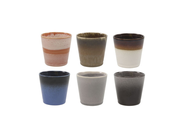 Produktinformation, 6 Stück, Spülmaschinenfest, Material Steingut, Moderne Form ohne Henkel, Passt in jeden Haushalt, Ideal für warme Getränke wie Kaffee und Tee, Schlichte Farbpalette in Brauntönen, Schöne Struktur durch Lasierung