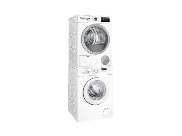 101253 | Bosch Wärmepumpentrockner WTH85V51CH 8 kg A++, Beladungsart: Frontloader, Energieverbrauch: 236 kWh / Jahr, Energieeffizienzklasse: A++, Anzahl Programme: 9, Nennkapazität: 8 kg, Türanschlag: Rechts, Ablaufgarnitur: Inklusive (in der Lieferung enthalten), Geräuschpegel: 65 dB(A), Masse: 842 x 598 x 613 mm, , Weitere Infos zu diesem Produkt findest du hier, , 107079 | Bosch Waschmaschine WAJ280V1CH 7 kg B, Nennkapazität: 7 kg, Energieeffizienzklasse: B, Anzahl Programme: 8, Max. Schleuderdrehzahl: 1'400 U / min, Wasserverbrauch: 45 l / Zyklus, Energieverbrauch: 51 kWh / 100 Zyklen, Trommelvolumen: 55 l, Türanschlag: Links, Geräuschpegel Schleudern: 75 dB(A), Masse: 848 x 598 x 546 mm, , , Weitere Infos zu diesem Produkt findest du unter Downloads, , , 017609 | Bosch Verbindungssatz WTZ20410, Zwischenbausatz für den sicheren Aufbau eines Waschturms, Masse: 35 x 593 x 668 mm, , Weitere Infos zu diesem Produkt findest du hier