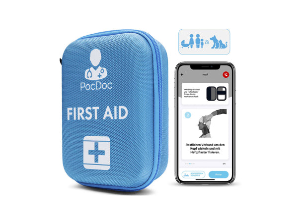 Produktinformation:, , Sichtbarer Notfallbutton, Verpackung aus hochwertigem EVA (Ethylen-Vinylacetat-Copolymere, Grosszügig dimensionierte Fächer ermöglichen die Erweiterung des Inhalts durch eigene Bestandteile (z.B. Fieberthermometer). , PodDoc App beinhaltet über 300 einzelne Behandlungsschritte, welche von der Versorgung einer Blutung bis hin zum richtigen Handeln beim Ausfall der Atmung reichen, Für den Strassenverkehr zugelassen und passt bequem in jeden Kofferraum, Die PocDoc App ist mehrsprachig (Deutsch, Englisch, Französisch, Spanisch, Italienisch), Offline App – funktionier auch ohne Internet, Behandlung von Babys, Kleinkindern, Erwachsenen problemlos möglich & detailliert erklärt, Mit PocDoc® Outdoor / Pet lassen sich auch Hunde und Katzen behandeln, , Lieferumfang: , , 1 Schere DIN 58279-A 145, 2 Fixierbinde DIN 61634 - FB6, 2 Fixierbinde DIN 61634 - FB8, 1 Heftpflaster DIN 13019 - A5 x 2,5, 1 Rettungsdecke (metallisierte Polyesterfolie 210 x 160cm), 1 Verbandspäckchen DIN 13151 - K, 1 Verbandspäckchen DIN 13151 - M, 1 Verbandspäckchen DIN 13151 - G, 1 Sofort-Kälte-Kompresse, 6 Kompresse 10cm x 10cm, 4 Einmalhandschuhe aus PVC DIN EN455, 1 Fertigpflasterset, 14-teilig, 2 Dreieckstuch DIN 13168-D, 1 Splitterpinzette, 1 Verbandtuch DIN 13152-A, 60 x 80cm, 1 Verbandtuch DIN 13152-BR, 40 x 60cm, 2 Feuchttücher zur Hautreinigung, 2 Wundreinigungstücher, 1 Beatmungstuch