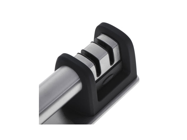Das Schärfen in mehreren Schritten ermöglicht eine bessere Qualität des Endprodukts. Im ersten Schritt kann ein Grundschliff mit dem Hartmetallschärfer vorgenommen werden. Für den Feinschliff wird das Messer mehrfach durch den Keramikschärfer durchgezogen.