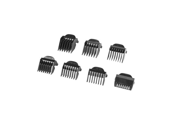 Produktinformation:, Klingenschutz mit Kamm zum Ausdünnen, Mit Anzeige der Lade-/Restzeit, Alarm bei schwachem Akku, LCD-Display, Öl-Hinweis, 60 Min. Akku-Laufzeit, 1 Flasche Öl und Reinigungsbürste inklusive, , 6 Aufsteckkämme:, 4-6 mm, 7-9 mm, 10-12 mm, 16-18 mm, 22-24 mm, 28-30 mm