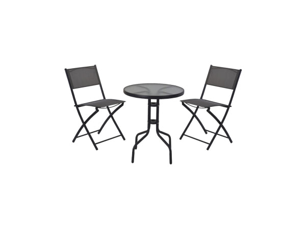 Produktinformation:, 3-teilig, 2 Stühle, 1 Tisch, Tisch aus Metall, Tisch mit Glasplatte, Max. Belastung Tisch 50 kg, Klappstühle mit gewebtem Polyester, Stuhlgestell aus Eisen, Dunkelgrau mit schwarz