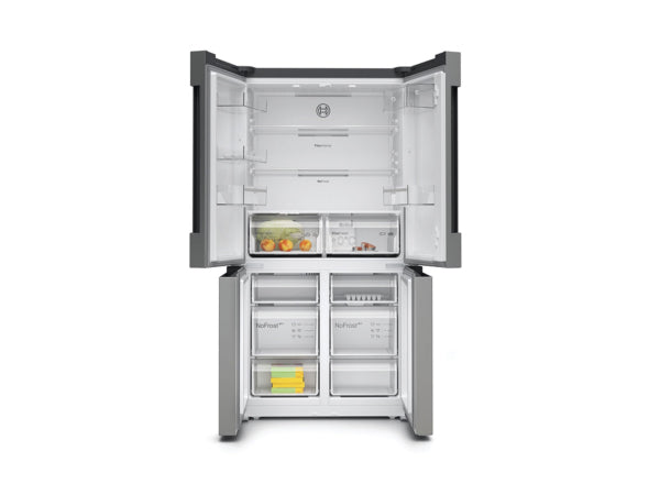 Produktinformation:, Design, Tür Edelstahl mit Anti-Fingerprint, Seitenwände chrome-inoxmetallic, LED-Beleuchtung im Kühlteil, Plastikrückwand, Innenausstattung mit Metall-Applikationen, , Komfort und Sicherheit, Elektronische Temperaturregelung, exakt digital ablesbar, Super Kühlen: automatische Deaktivierung, Abtau-Automatik im Kühlteil, Akustischer Alarm, Warnanzeige bei Temperaturanstieg, Kühlteil, No Frost Ausprägungen: Multi Airflow, 3 Abstellflächen aus Sicherheitsglas, davon 2 höhenverstellbar, und ausziehbar, 2 durchgehende Türabsteller, 2 kleine Türabsteller, ohne / 0, Butter-/Käsefach mit Klappe, Frischhaltesystem, 1 VitaFresh ◄0°C► Schublade - Fisch und Fleisch bleiben, länger frisch, 1 VitaFresh Schublade auf Rollen mit Feuchtigkeitsregulierung, hält Obst und Gemüse vitaminreich und länger frisch, Gefrierteil, Nutzinhalt Gefrierteil: 200 l, 6 transparente Gefriergut-Schubladen, Eiswürfelschale, Technische Informationen, 4 Rollen zum leichteren Transport, 3 davon höhenverstellbar, zur Ausrichtung, Länge Netzkabel: 240 cm