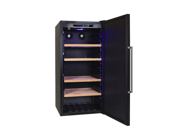 Der Weinklimaschrank der Traditionsmarke Bodega bietet Platz für 165 75 cl Flaschen. Dank seiner modernen und schlichten Optik peppt er jeden Keller – bzw. Weinkeller im Nu auf. Die schwarze Glastür mit energieeffizientem Glas spart nebst der Energie auch den Geldbeutel. , , Die vier Holzregale bieten dem edelsten Tropfen ein neues sicheres Zuhause, so dass der Wein optimal horizontal gelagert wird. Die Holzregale können je nach Bedarf unterschiedlich positioniert werden. Zudem bietet der Boden Platz für 4-6 Flaschen.