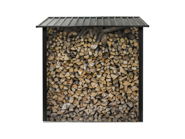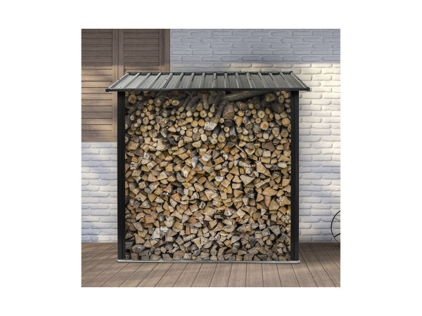 Produktinformation:, Viel Platz für Brennholz, Auch als Geräteunterstand verwendbar, Hohe Schneelast, Masse 154 x 83 x 157 cm , Rahmendicke 0.4 – 0.8 mm , Dach 0.25 mm mit Vollwandverstrebung