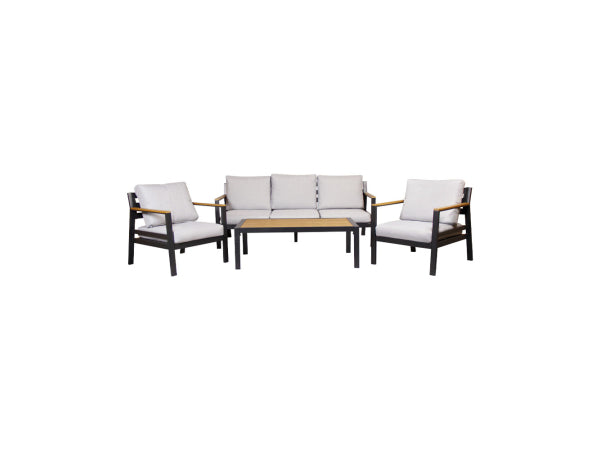 Die gemütliche CONTINI Lounge Teramo bietet viel Platz und lädt zum Verweilen ein. Das schlichte Design wirkt stimmig und passt im Garten genauso gut wie auf der Terrasse oder dem Balkon., Die 10 cm hohen Polster garantieren einen weichen Sitz für angenehme entspannende Stunden. Die zwei 1-Sessel können auch als Art Bank beieinander gestellt werden., , Produktinformation:, Schlichtes edles Design, Rostfreier Aluminiumstahlrahmen, Schöner Tisch mit Holzoberfläche & schwarzem Rahmen, Robustes und langlebiges Material, Abnehmbare Kissen, Kissenfarbe: Grau, Kissendicke: 10 cm, Wenn möglich vor der Witterung geschützt lagern, , Lieferumfang:, 1x 3-Sofa 190 x 79 x 74.5 cm, 2x 1-Sofa 70 x 79 x 74.5 cm, 1x Tisch 120 x 69 x 40 cm