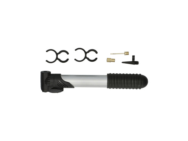 Produktinformation, , Lässt sich praktisch am Velorahmen montieren, Mit drei verschiedenen Adapter, Für alle gängigen Velos geeignet, Kompakte Grösse: (20-46 cm), Einfach zu verwenden, Ausstattung:, , 1 x Mini-Fahrradpumpe, 1 x Adapter für Autoventil, 1 x Dunlop-Ventiladapter, 1 x französischer Ventiladapter, 2 x Halterungen