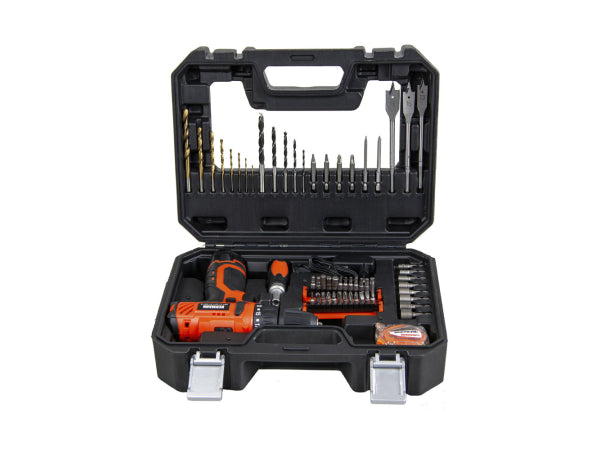 Im Set enthalten:, 1x 12V Elektrowerkzeug, 3x Flache Bohraufsätze für Holz: 13-16-19mm , 8x Spiralbohraufsätze: 1.5-2-2.5-3-4-5-6-8mm , 5x Holzbohraufsätze: 3-4-5-6-8mm , 8x 38mm Bohrfutter: 4-5-6-8-10-11-12-13mm , 4x 1/4*50mm bit PH2-3,SL5-6, 2x 1/4*75mm bit PH1,SL4, 24x 1/4*25mm bit:SL:4-5.5-7,PH:1-2-3-4,PZ:1-2-3-4,, H:4-5-6-7-8,T8-10-15-20-25-27-30-40 , 1x Bit-Magnethalter , 2x 3M Massband , 3x Ratschenaufsätze, , Produktinformation:, 2 variable Geschwindigkeiten: 0-400/1350 U/min., Bohrfutter:10mm, Motor: 550 Motor, LED-Licht mit Spindelarretierung , Akkulaufzeit: 3-5 h, 1 Ladegerät, Inkl. Koffer