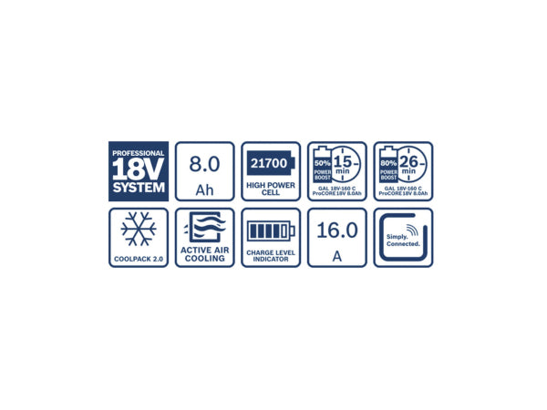 2x Akku 18 V 8.0 Ah:, Akkuspannung: 18 V, Akkukapazität: 8.0 Ah, Gewicht Akku 955g, Leistungsstark: 87 % mehr Leistung - dank neuer Zellengeneration in Kombination mit der Bosch-eigenen Kompetenz bei Akkus, Kompatibel: 100 % kompatibel mit allen Bosch Professional 18V Werkzeugen & Ladegeräten – dank Flexible Power System, Langlebig: Bis zu 135 % längere Lebensdauer gegenüber einem herkömmlichen Akkupack – dank verbesserter COOLPACK 2.0-Technologie zum Schutz des Akkus vor Überhitzung, , Ladegerät GAL 1880CV:, Akkuladespannung: 14.4 – 18 V, Ladestrom: 8 A, Ladezeit bei Akkukapazität 1.5 Ah (80 % / 100 %): Ca. 10 / 25 min, Ladezeit bei Akkukapazität 2.0 Ah (80 % / 100 %): Ca. 15 / 30 min, Ladezeit bei Akkukapazität 3.0 Ah (80 % / 100 %): Ca. 20 / 35 min, Ladezeit bei Akkukapazität 4.0 Ah (80 % / 100 %): Ca. 25 / 35 min, Ladezeit bei Akkukapazität 5.0 Ah (80 % / 100 %): Ca. 30 / 45 min, Ladezeit bei Akkukapazität 6.0 Ah (80 % / 100 %): Ca. 35 / 55 min, Ladezeit bei Akkukapazität 6.3 Ah (80 % / 100 %): Ca. 41 / 55 min, 50 % schnelleres Aufladen der Akkus (im Vergleich mit AL 1860 CV), Active Air Cooling für längere Lebensdauer der Akkus