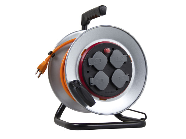 Ausführung:, Kabel: 25 Meter | 3x 1.5 mm², Anschlussstecker: 1x T12, Steckdose: 4x T13, Stossdämpfendes und stabiles Fussgestell, Ergonomisch geformter Haltegriff, , Ideal für:, Baugeschäfte, Werkstätte, Profi-Heimwerker, Hobbyaktivitäten