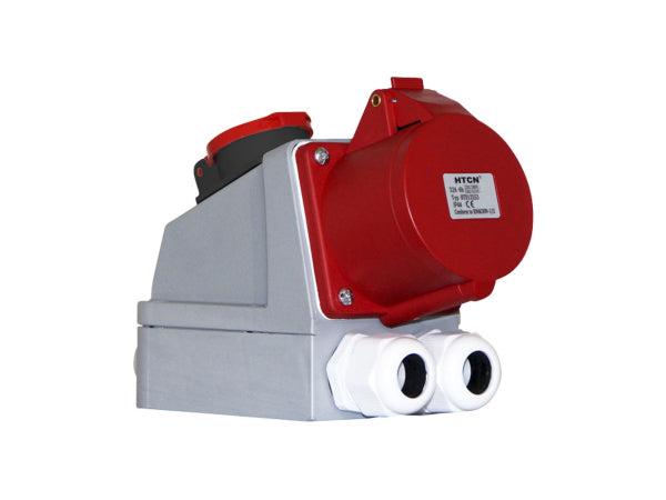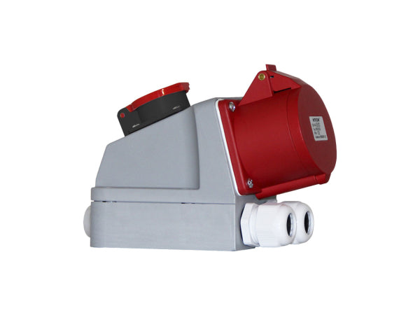 Produktinformation:, CEE32A Aufputz-Steckdose, 2 Kabel Einführungen, Geeignet zur Wandmontage, Mit Klappdeckel, Spritzwassergeschützt, 5-polig