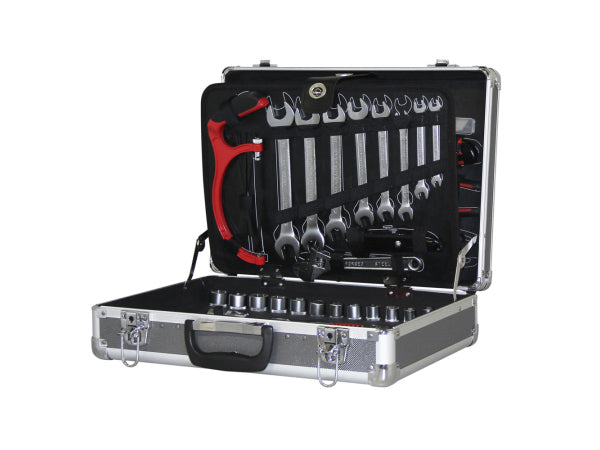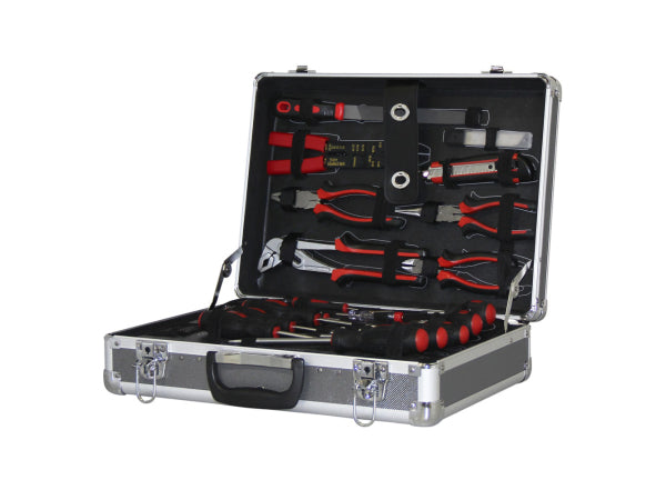 Ausführung: Gabelschlüssel 8 Stk. (6/7, 8/9, 10/11, 12/13, 14/, : 15, 16/17, 18/19, 20/22), : Rollgabelschlüssel 1 Stk., : Inbusschlüssel 9 Stk. (1.5, 2, 2.5, 3, 4, 5, 6, 8, 10 mm), : Teppichmesser 1 Stk., : Messerkasten 1 Stk., : (inkl. 3 Klingen für Teppichmesser), : Zink-Aluminium Messer 1 Stk., : Schraubendreher 7 Stk., : Schraubendreher Bithalter 1 Stk., : Präzisionsschraubendreher 2 Stk., : Phasenprüfer 1 Stk. (220 - 250V), : Kombizange 1 Stk. (8"), : Diagonalschneidezange 1 Stk. (6"), : Wasserpumpenzange 1 Stk. (10"), : Spitzzange 1 Stk. (8"), : Abisloierzange 1 Stk. (9.5"(200 mm), : Bügelsäge 1 Stk. (150 mm), : Sägeblatt 6 Stk. (150 mm), : Massband 1 Stk. (5 m)), : Flachfeile 1 Stk. (200 mm), : Hammer 1 Stk. (300 g), : Zündkerzenschlüssel: 1 Stk. (1/2"(21 mm), : 72T Ratschenschlüssel: 1 Stk. (1/2"), : Ratschen-Verlängerung: 2 Stk. (1/2"(75 & 125 mm), : Ratschen-Aufsätze: 15 Stk. (1/2"(8, 9, 10, 11, 12, 13, 14,, : 15, 16, 17, 18, 19, 20, 21, 22), : BIT-Aufsätze: 42 Stk. (25 mm), : Schnellspanner: 1Stk. (60 mm), Höhe: 130 mm, Breite: 440 mm, Länge: 330 mm, Gewicht: 9.2 kg, Garantie: 24 Monate (2 Jahre)
