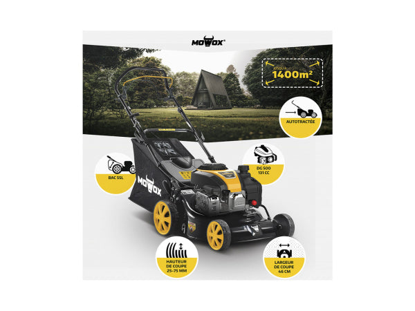 Produktinformation, Motor MOWOX DG500, Motorstartkonfiguration Ziehen / Primer, Motordrehzahl (feste Drehzahl) 2800, Motorleistung min. (in kW) 1,9 kW, 1-Gang Antrieb, Hubraum (cc) 131, Schnittbreite: 460 mm, Schnitthöhe 25-75 mm, 10-stufige Schnitthöhenverstellung, Mulchmesser, Mulchkit/Mulchfunktion, Selbstfahrfunktion, EasyClean Funktion, Ohne Seitenauswurffunktion , Holm mit Schnellspannfunktion, 55 Liter Fangsack und mit Füllstandsanzeige, Stahlgehäuse