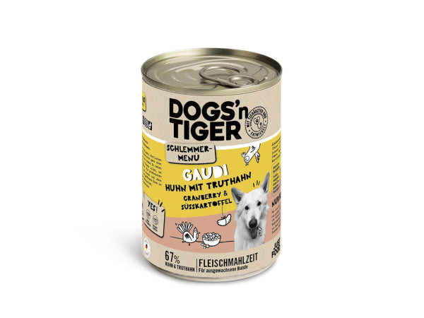 Zartes Huhn mit Truthahn an knackigen Cranberries und leckerer Süsskartoffel, , Unser Schlemmermenü Gaudi vereint köstliche Zutaten und hochwertige Inhaltsstoffe, um selbst den wählerischsten Doggo zu verwöhnen. Entdecke das Beste aus der Natur, verpackt in einer vollwertigen Fleischmahlzeit, die nicht nur lecker ist, sondern auch höchsten Ansprüchen an Verträglichkeit und Qualität gerecht wird. , , Ein extra hoher Fleischanteil mit 53% Huhn und 10% Truthahn kombiniert mit leckerer Fleischbrühe machen das Menü super saftig. Die Kombination aus hochwertigem Fleisch, wertvollen Innereien und viel frischem Gemüse und Obst verfeinert mit aromatischen Kräutern deckt die natürlichen Bedürfnisse Deines Hundes optimal ab. Die Zugabe von Leinöl, Bierhefe, Eierschalenpulver und weiteren hochwertigen Zutaten steuert wichtige Vitamine, Mineralstoffe und Spurenelemente, die für das Wachstum benötigt werden, bei. , , Eine köstliche Kombination aus Geschmack und Wohlbefinden – das sind unsere Schlemmermenüs. , , Alleinfuttermittel für Hunde