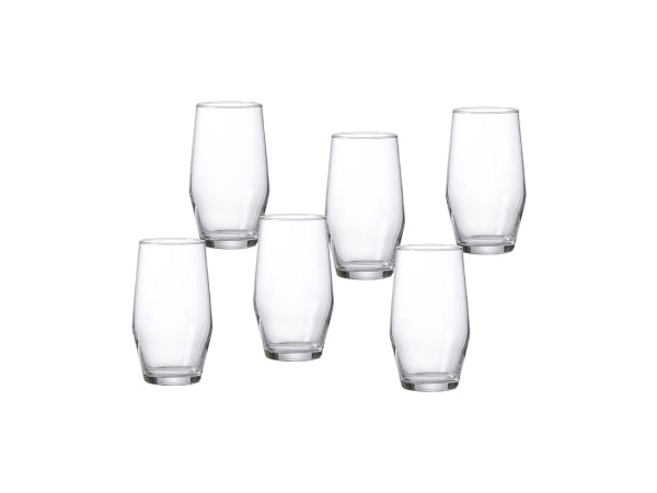 Produktinformationen, , Kapazität je Glas: 370 ml, Material: Glas, Farbe: Klar, Besonderheiten: Sanfte Formübergänge, spülmaschinengeeignet, robust und kristallklar, Abmessungen der Verpackung: Breite 17 cm, Länge 25 cm, Höhe 15 cm, 6 Stücke