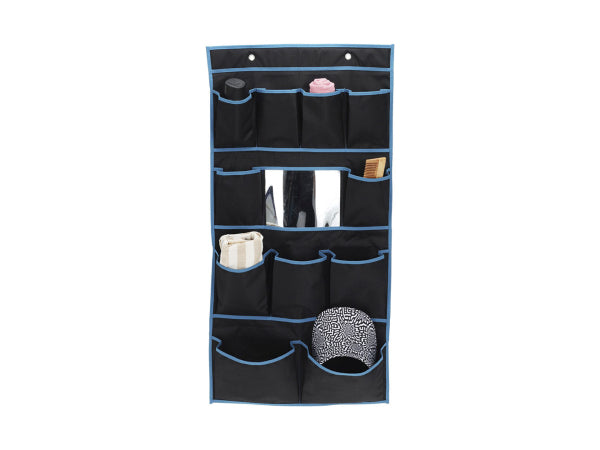 Produktinformation, , 11 Fächer und ein Spiegel, Für zuhause oder Unterwegs, Zusammenfaltbar, Zwei Haken zum Aufhängen