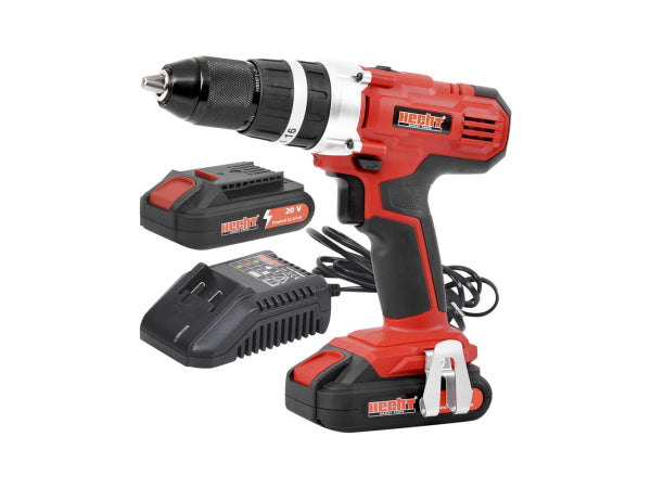 Produktinformation:, Hohes Drehmoment mit 16 Drehmomenten bis 35 Nm, Rechts-Linkslauf-Einstellung, Inkl. 2 x 20 Volt Li-Ion Akkus mit Akkuladedauer von 1 Stunde, Schnellstop Funktion, Schlagbohrfunktion, 2 Stufen Metallgetriebe, Schnellspannbohrfutter, Bohrfutterspannweite: 2 – 13 mm, Gutes Handling dank gummiertem Handgriff, LED-Leuchte, , Inhalt:, Akkuschrauber, Zwei Li-Ion Akkus, Ein Ladegerät, Sechs Bits, Sechs Bohrer, Transport-Koffer
