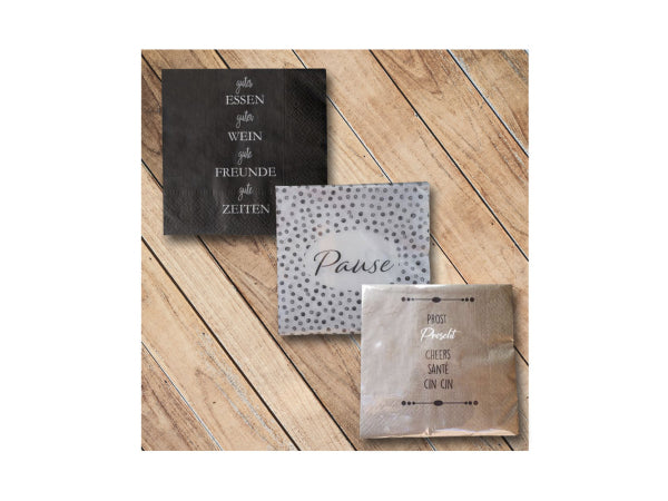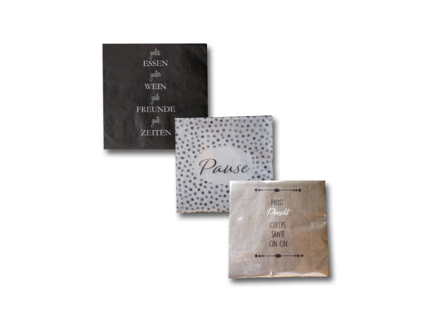 Produktinformation, , 3er Servietten Set bestehend aus:, 1x Schwarz «Gutes Essen – Gute Freunde», 1 x Weiss / gepunktet «Pause», 1 x Beige «Prost»
