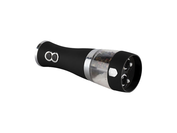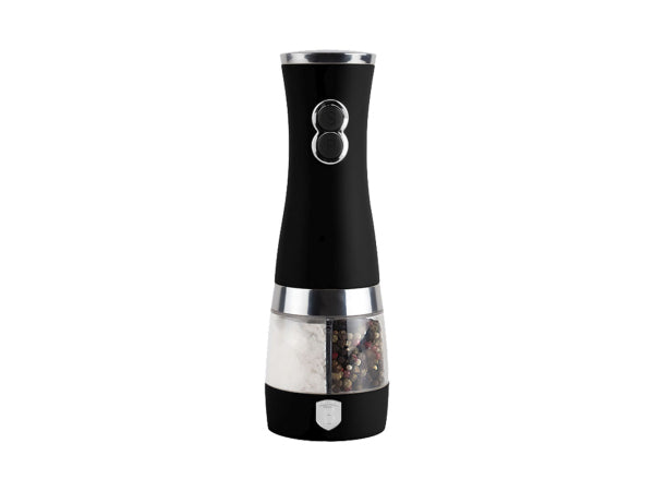 Der Berlinger Haus Salz- und Pfefferstreuer 2 in 1 aus der Matte Black Collection verleiht deiner Küche sowohl Stil als auch Funktionalität. Gefertigt aus hochwertigem Edelstahl mit einem Keramikmahlwerk, ermöglicht er eine bequeme Einhandbedienung durch zwei Tasten. Der elektrische Streuer, der 6 AA-Batterien (nicht enthalten) benötigt, verfügt über einen leicht nachfüllbaren doppelwandigen Acrylbehälter., , , Produktinformation, , Batterien: 6 Stück AA (nicht enthalten), Zwei Tasten für die Bedienung, Einhandbedienung, Leicht nachfüllbar, Doppelwandiger Acrylbehälter, Elektrisch, Premiumqualität Edelstahl, Stilvoll