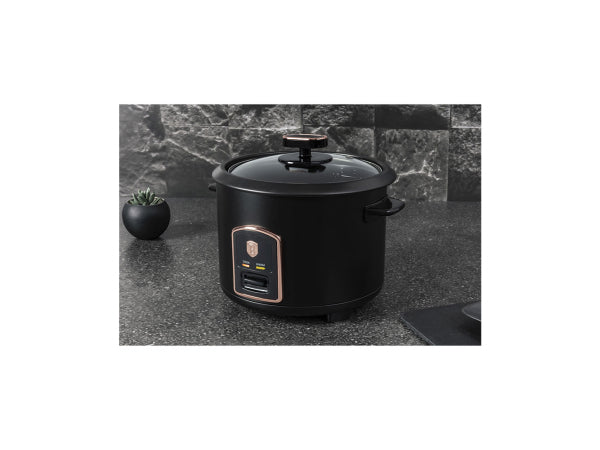 Der Berlinger Haus Reiskocher aus der Black Rose Collection ist die perfekte Lösung für alle Reisliebhaber. Mit einer Kapazität von bis zu 10 Tassen Reis ist er ideal für Familien und Gäste. Das elegante Design fügt sich harmonisch in jede Küche ein und macht ihn zu einem stilvollen Küchenhelfer. Der antihaftbeschichtete Aluminium-Innentopf sorgt dafür, dass der Reis gleichmässig gart und nicht anhaftet, was die Reinigung zum Kinderspiel macht. Der Glasdeckel ermöglicht eine einfache Überwachung des Kochvorgangs, ohne den Deckel anzuheben. Mit zwei stabilen Griffen ist der Reiskocher sicher und bequem in der Handhabung. Aus hochwertigen Materialien wie Edelstahl, Aluminium, Glas und Kunststoff gefertigt, bietet er nicht nur Funktionalität, sondern auch Langlebigkeit. Ausgestattet mit einem VDE-Stecker und einem 110 cm langen PVC-Kabel ist dieser Reiskocher die ideale Wahl für schnelles und einfaches Reis kochen., , , Produktinformation, , Zubereitung von bis zu 10 Tassen Reis möglich, VDE-Stecker mit PVC-Kabel (110 cm, einschliesslich Stecker), Perfekt zum schnellen Kochen von Reis, Elegantes Design, Antihaftbeschichteter Aluminium-Innentopf, Glasdeckel um den Kochvorgang überwachen, 2 Griffe für sicheren und bequemen Gebrauch