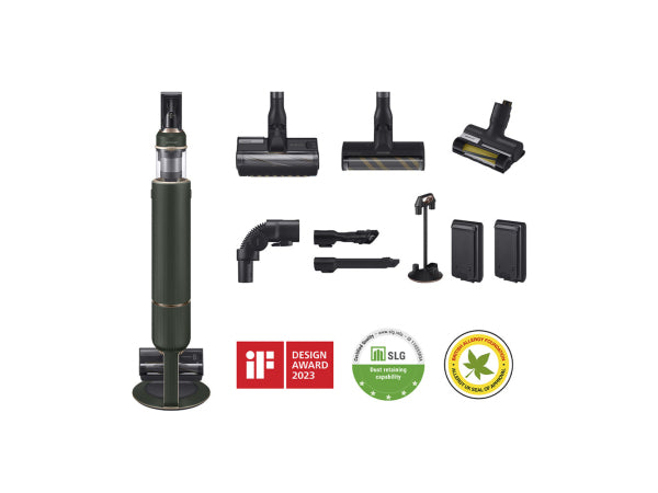 Entdecke die Spitzenleistung mit dem Samsung VS9500AL Bespoke Jet One Akku-Staubsauger! Dieses wegweisende Reinigungsgerät bietet eine unschlagbare Kombination aus Leistung, Vielseitigkeit und Benutzerfreundlichkeit., , Die beeindruckende Saugkraft des Bespoke Jet One ermöglicht eine gründliche Reinigung von Teppichen, Holzböden und anderen Oberflächen. Egal ob Staub, Schmutz oder Tierhaare, dieser Staubsauger liefert makellose Ergebnisse., , Dank der leistungsstarken Akkus kannst du bis zu 120 Minuten lang kabellos reinigen. Mit den vielseitigen Aufsätzen passt sich der Staubsauger an verschiedene Oberflächen an - von Böden bis hin zu schwer erreichbaren Ecken., , Die All-in-on Clean Station übernimmt für dich die Staubbehälter-Entleerung mit nur einem Knopfdruck und vermeidet somit Schmutzkontakt und erleichtert dir die Wartung., , Der Bespoke Jet One besticht durch seinen modernen Stil und der All-in-one Clean Station, die eine bequeme Aufbewahrung ermöglicht. Geniesse ein sauberes Zuhause in neuer Dimension., , Produktinformation, , All-in-one Clean Station – leert den Staubbehälter und lädt den Akku auf, Leichtes und ergonomisches Design, 210 W saugkraft, 120 min. Akkulaufzeit, Für alle Bodenbeläge, Alles im Blick dank LCD_Display, HexaJet Motor liefert starke Eingangsleistung, Hohe Energieeffizienz und Saugleistung, 5-fach-Filterung, Farbe: Woody Green, , , Spray Spinning Sweeper:, Feuchte Reinigung für harte Böden, 150ml Wassertank, , Lieferumfang:, , All-in-one Clean Station, Batterien (2 Stück), Jet Dual-Bürste, Pet-Bürste, Kombinationsaufsatz, Erweiterungsaufsatz, Flexibler Aufsatz, Staubbeutel (3×)