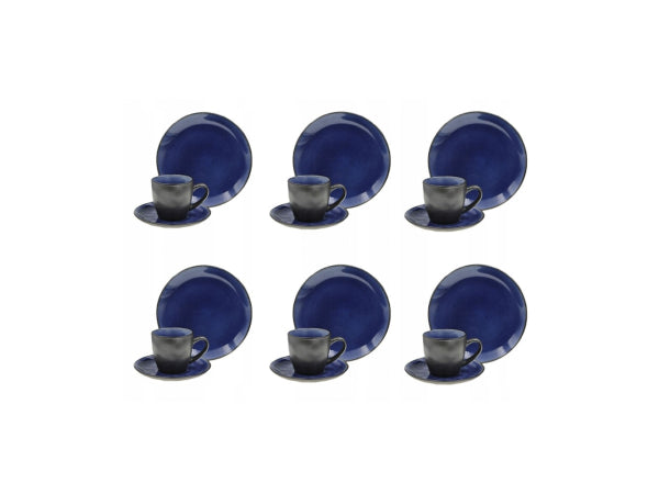 Das 18-teilige Kaffeeset von Tavola ist perfekt für jeden Kaffeeliebhaber, der ein stilvolles und ansprechendes Kaffeeset sucht., Das Set besteht aus sechs Kaffeetassen, sechs Untertassen und sechs Desserttellern, die alle aus hochwertigem Porzellan gefertigt sind., , Das Design des Kaffeesets ist modern und elegant, mit seinen marineblauen glasierten und mattschwarzen Farben gibt das Set einen erstaunlichen Eindruck von Frische und Energie, der deinen Tisch zum Leuchten bringt., Das Kaffeeset ist spülmaschinen- und mikrowellengeeignet, was es ideal für den täglichen Gebraucht macht. Es ist auch langlebig für den regelmässigen Einsatz. Das Set ist perfekt für Kaffeeliebhaber, die ihre Gäste stilvoll bewirten möchten., , , Produktinformation, , Spülmaschinenfest, Mikrowellengeeignet, , , Inhalt, , 6x Tassen 150ml, 6x Untertassen ø 14cm, 6x Dessertteller ø 19cm