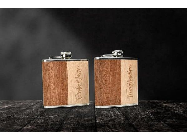 Dieser edle Flachmann ist mit einem dünnen 2-farbigen Holzfurnier umhüllt und ist für jeden Anlass bestens geeignet. Die Holzoberfläche ist von Hand mit einem Öl behandelt worden, damit die Holzstruktur besser zur Geltung kommt. Produktbeschreibung: Füllmenge: 177 ml Grösse: 9.5 cm x 2.2 cm x 11 cm Material: Edelstahl mit geöltem Echtholzfurnier