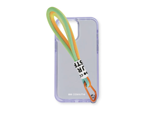 An der Unterseite der Hülle befindet sich ein weicher Riemen in Fluo-Farben. Dank des praktischen Karabinerhakens können Sie ihn jederzeit anbringen und abnehmen und ihn auf verschiedene Weise verwenden: um Ihr Mobiltelefon am Handgelenk zu tragen, um einen Rucksack zu personalisieren oder um Ihre Hausschlüssel bei sich zu haben.