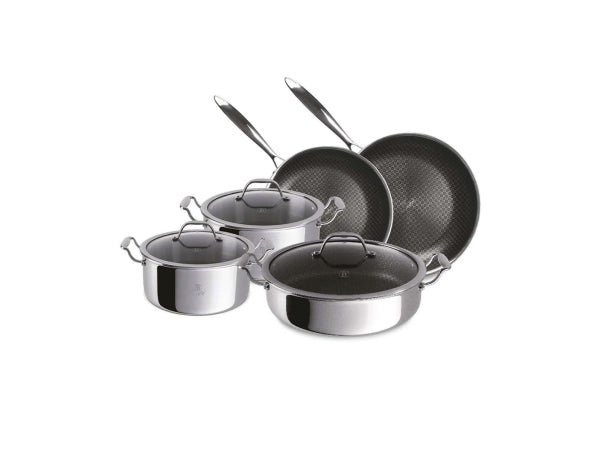 Kochen wird mit dem 8-teiligen Kochgeschirrset der Eternal Collection von Berlinger Haus zum echten Vergnügen! Das Set besteht aus hochwertigem, dreilagigem Edelstahl (18/10) mit einer langlebigen Whitford ETERNA-Beschichtung – perfekt für gleichmässiges Garen und leichte Reinigung. Du erhältst einen flachen Topf (Ø28 cm, 3,8 L), eine Kasserolle (Ø20 cm, 2,7 L), eine Stielkasserolle (Ø24 cm, 4,5 L) sowie zwei Bratpfannen (Ø24 cm und Ø28 cm). Die stabilen, gegossenen Griffe bieten dir sicheren Halt. Egal ob du auf Induktion kochst oder das Set im Backofen (bis 300 °C) nutzt – es passt sich deinem Stil an. Und nach dem Kochen? Einfach in die Spülmaschine. Ein echtes Highlight – mit dem geschützten Design von Berlinger Haus!