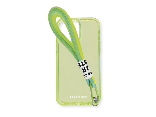 An der Unterseite der Hülle befindet sich ein weicher Riemen in Fluo-Farben. Dank des praktischen Karabinerhakens können Sie ihn jederzeit anbringen und abnehmen und ihn auf verschiedene Weise verwenden: um Ihr Mobiltelefon am Handgelenk zu tragen, um einen Rucksack zu personalisieren oder um Ihre Hausschlüssel bei sich zu haben.