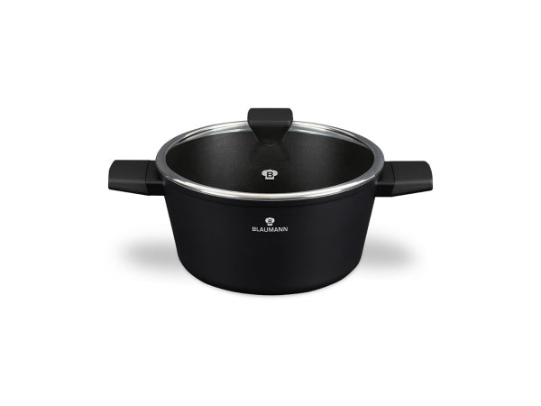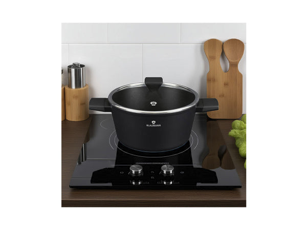 Kochen leicht gemacht – mit dem Blaumann Kochtopf Ø 28 cm aus der Black Silver Collection., Der robuste Aluminiumkörper sorgt für eine schnelle und gleichmässige Wärmeverteilung – ideal für stressfreies Kochen. Durch den Glasdeckel mit Dampfauslass behältst du jederzeit den Überblick und kannst sicher garen, ohne Hitze oder Geschmack zu verlieren. Die hitzebeständigen Griffe liegen gut in der Hand und bieten dir beim Hantieren optimalen Halt. Egal ob Suppen, Eintöpfe oder Pasta – dieser Topf ist ein echter Allrounder und funktioniert auf allen Herdarten, sogar auf Induktion. Die Antihaftbeschichtung verhindert Anbrennen und macht die Reinigung zum Kinderspiel. Du willst Qualität, Funktionalität und modernes Design in einem? Dann ist dieser Topf genau dein Küchenbegleiter.