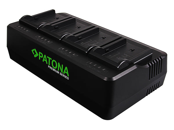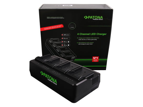Wir freuen uns, Ihnen ein weiteres Produkt unserer PATONA Premium- Produktreihe präsentieren zu können. Mit unserem 4-Kanal-Ladegerät können bis zu vier 8,4V / 16,8 V Li-Ionen-Akkus gleichzeitig laden. Eine intelligente Steuerung (MCU) regelt die Spannungsverteilung auf die 4 Kanäle. Das PATONA Premium 4-Kanal-Ladegerät verfügt über einen integrierten Überspannungsschutz. Technische Daten: Input: AC 100V-240V 50/60Hz Output: 8,4V x4 (8,3-8,5V) / 16,4V x4 (16,3-16,5V) Output: 2000mA x4 ± 200 mA (CV 7,2V) / 1000mA x4 ± 100mA (CV 14,4V) Schnellladefunktion Status-LED für jeden Kanal Gewicht: 0,6 kg Maße: 22 x 12,5 x 6cm (L x T x H) Lieferumfang: 1x 4-fach Ladegerät | 1x Netzkabel EU + 1x UK | 1x Anleitung Deutsch / Englisch / Spanisch / Französisch / Italienisch / Tschechisch Passend für folgende Akkumodelle: Panasonic VBD1, VBD2 Sony NP-FM50, NP-QM51, NP-QM71, NP-QM91, NP-F550, NP-F750, NP-F960, NP- F970, NP-FM500, NP-FM500H