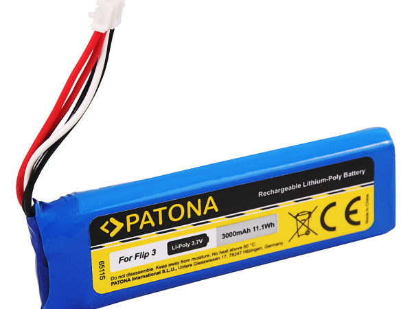 Hochleistungs-Akku mit neuen hochwertigen Markenzellen wie unter anderem von Panasonic, LG, Sanyo,... 100 % kompatibel mit den Original JBL Akkus durch maßgefertigte Passform inklusive Überladungs- und Kurzschlussschutz. Technische Daten: Spannung: 3,7 Volt Kapazität: 3000mA / 11,1Wh Typ: Li-Polymer Der Akku ist passend für folgende Modelle: JBL Flip 3 Original-Bezeichnung der JBL Akkus Dieser Akku ersetzt folgende Akkutypen: JBL GSP872693