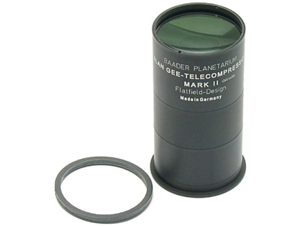 Reducer Alan Gee Mark II ist für Schmidt Cassegrain Teleskope von Celestron und Meade gemacht. Er reduziert die Brennweite und korrigiert das Bildfeld. Das Öffnungsverhältnis eines f/10 Schmidt Cassegrains wird auf f/5,9 verbessert. Die Belichtungszeit wird auf 35% reduziert. Die Bildfeldwölbung wird korrigiert, Sterne sind bis zum Bildfeldrand scharf. Nutzbares Bildfeld bis 32mm Durchmesser mit sehr guter Korrektur und guter Ausleuchtung. Der Alan Gee ist für alle Schmidt Cassegrain Teleskope von Celestron und Meade geeignet. Er ist nicht geeignet für EHD und ACF Teleskope. Lieferumfang ohne Anschlussadapter in robustem Kunststoffbehälter.