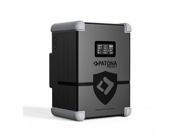 PATONA PROTECT Gold Mount Akku G99-PD100 99Wh USB-C USB-A D-Tap 2xDC- out.Das Akku-Gehäuse aus V1 Material gewährleistet das Widerstehen von Gehäuse-Temperaturen von bis zu 90 Grad, ohne sich zu verformen. Eines der Highlights ist der Stoß- und Fallschutz an den Ecken, dieser schützt Ihren Akku vor unliebsamen Schäden. Als weiteres Highlight hat dieser Akku einen USB-C PD100W Eingang, damit erreichen Sie eine Vollladung in einer Zeit von 2,5 - 3,5 Stunden.Auf dem integrierten OLED-Display haben Sie alle wichtigen Informationen im Blick. Kapazität: 6.800mAh/14,54V/99Wh Wattstundenbereich: 99-102Wh Leistungsbereich: 6.800-7.000mAh Input Typ C: PD100W/20V/5A / maximale Aufladezeit (volle Ladung): 2,5~3,5 Stunden Input BP: 16,8V/8A Input D-Tap: 16,8V/8A Output USB-C: PD100W/5V/3A,9V/3A,12V/3A,15V/3A,20V/5A BP Output: 14,54V/13A (max) Output D-Tap: 100W Output DC: DC1: 8,4V/3,0A(max) / DC2: 12V/3,0A(max) Output USB-A: 5V/3A, 9V/2A, 12V/2A, 24W(max) Max. Entladestrom: 13A Anschluss Typ: Gold Mount Typ: Li-Ion Zellentyp: LG MJ1 Anzahl der Zellen:8 Arbeitstemperatur: -10C bis +60C Gewicht: 620gr Maße: 110x78,4x68,4mm