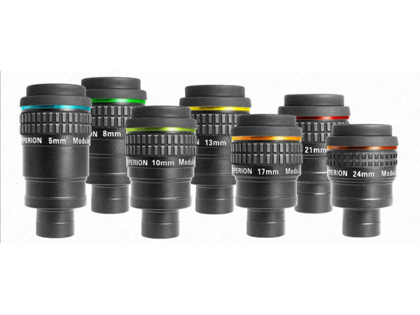 - Okularsatz mit allen sieben Hyperion Brennweiten (5, 8, 10, 13, 17, 21, 24 mm), inkl. Okularkoffer - Riesiges 68 Grad Weitwinkel-Gesichtsfeld, angepasst auf den maximalen Sehwinkel des menschlichen Auges - Phantom Group-Vergütung in Zeiss-Klasse für völlige Reflexfreiheit und maximalen Bildkontrast - Modularer Aufbau des Okularkörpers ermöglicht Änderung der Okularbrennweite mit optionalen Finetuning-Ringen - Kameratauglich! Es lassen sich fast alle DSLR Kameragehäuse aber auch einfachere Kameras mit Festobjektiv direkt an den Hyperion Okularen anschliessen