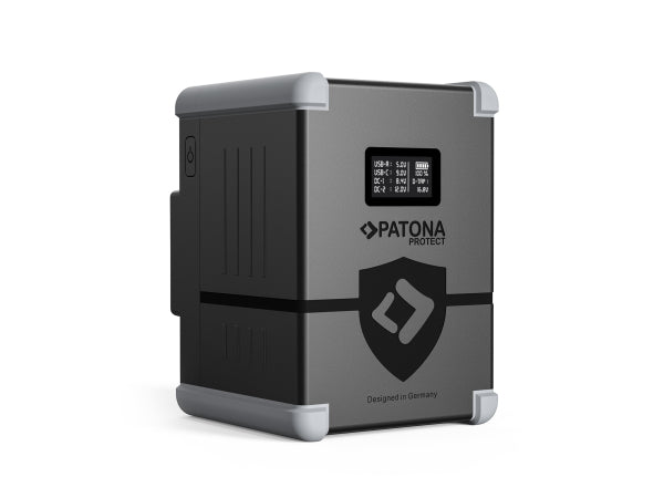PATONA PROTECT Gold Mount Akku G150-PD100 148Wh USB-C USB-A D-Tap 2xDC-out, Das Akku-Gehäuse aus V1 Material gewährleistet das Widerstehen von Gehäuse-Temperaturen von bis zu 90 Grad, ohne sich zu verformen. Eines der Highlights ist der Stoß- und Fallschutz an den Ecken, dieser schützt Ihren Akku vor unliebsamen Schäden. Als weiteres Highlight hat dieser Akku einen USB-C PD100W Eingang, damit erreichen Sie eine Vollladung in einer Zeit von 2,5 - 3,5 Stunden.Auf dem integrierten OLED-Display haben Sie alle wichtigen Informationen im Blick. Kapazität: 10200mAh/14,54V/148Wh Wattstundenbereich: 148-153Wh Leistungsbereich: 10.200-10.500mAh Input Typ C: PD100W/20V/5A / maximale Aufladezeit (volle Ladung): 2,5~3,5 Stunden Input BP: 16,8V/8A Input D-Tap: 16,8V/8A Output USB-C: PD100W/5V/3A,9V/3A,12V/3A,15V/3A,20V/5A BP Output: 14,54V/13A (max) Output D-Tap: 150W Output DC: DC1: 8,4V/3,0A(max) / DC2: 12V/3,0A(max) Output USB-A: 5V/3A, 9V/2A, 12V/2A, 24W(max) Max. Entladestrom: 13A Anschluss Typ: Gold Mount Typ: Li-Ion Zellentyp: LG MJ1 Anzahl der Zellen:12 Arbeitstemperatur: -10C bis +60C Gewicht: 860gr Maße: 110,5x78,4x87mm