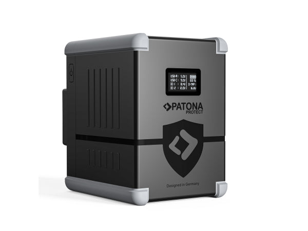PATONA PROTECT Gold Mount Akku G200-PD100 198Wh USB-C USB-A D-Tap 2xDC-out Das Akku-Gehäuse aus V1 Material gewährleistet das Widerstehen von Gehäuse-Temperaturen von bis zu 90 Grad, ohne sich zu verformen. Eines der Highlights ist der Stoß- und Fallschutz an den Ecken, dieser schützt Ihren Akku vor unliebsamen Schäden. Als weiteres Highlight hat dieser Akku einen USB-C PD100W Eingang, damit erreichen Sie eine Vollladung in einer Zeit von 2,5 - 3,5 Stunden.Auf dem integrierten OLED-Display haben Sie alle wichtigen Informationen im Blick. Kapazität: 13.600mAh/14,54V/198Wh Wattstundenbereich: 198-204 Leistungsbereich: 13.600-14.000mAh Input Typ C: PD100W/20V/5A / maximale Aufladezeit (volle Ladung): 2,5~4,5 Stunden Input BP: 16,8V/8A Input D-Tap: 16,8V/8A Output USB-C: PD100W/5V/3A,9V/3A,12V/3A,15V/3A,20V/5A BP Output: 14,4V/13A (max) Output D-Tap: 150W Output USB-A: 5V/3A, 9V/2A, 12V/2A, 24W(max) Max. Entladestrom: 13A Anschluss Typ: Gold Mount Typ: Li-Ion Zellentyp: LG MJ1 Anzahl der Zellen: 16 Gewicht: 1065gr Maße: 110,5x78,4x105,6mm