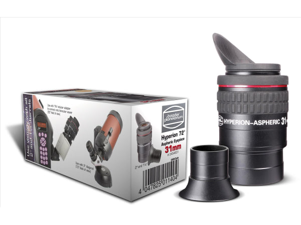 31mm Aspheric 2" Okular mit Reduzierstück auf 1¼" Steckdurchmesser und inkl. Gummi-Augenmuschel /Seitenlichtblende #2454653. Die asphärische Korrektur eines optischen Systems behebt zahlreiche Abbildungsfehler. Die Schärfe wird über das gesamte Bildfeld aufrecht erhalten und die Verzeichnung wird auf ein Minimum reduziert. Darüber hinaus kann das Okular wesentlich kompakter und leichter hergestellt werden. Hervorragendes Einblickverhalten ohne "Kidney Bean" Effekt. Extrem leicht und klein und als fotografisches Planprojektiv mit allen Anschlüssen des Hyperion-Systems verwendbar. Optimierte Phantom Multivergütung für maximale Transmission und sehr guten Kontrast. Adaption auf T2 für Spiegelreflexkameras und auf fast alle Filtergewinde von digitalen Kameras. 1,25" Adapter im Lieferumfang enthalten. Brennweite: 31mm, Gesichtsfeld: 72°, Gewicht: ca. 400g Vergütung: Multivergütung auf jeder Glas/Luftfläche