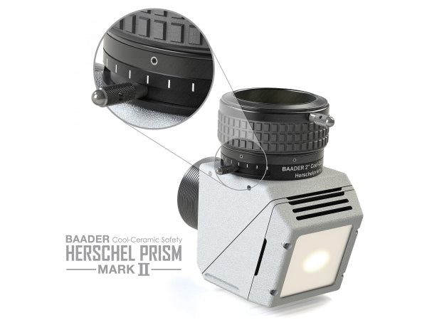 Visuel. - 2" Keilprisma nach Herschel - einseitig Phantom Group® entspiegelt, mit Keramik-Sonnensucher und 2" ClickLock® Okularklemme. - Integrierte Rotationsvorrichtung für Polarisationsfilter - die beste Methode für die Helligkeitseinstellung bei der visuellen Sonnenbeobachtung und Sonnenfotografie im Weißlicht. - Ermöglicht in Kombination mit dem optionalen Polarisationsfilter 2", (#2408342) und dem mitgelieferten Neutraldichte (Grau-)Filter eine stufenlose Helligkeitsverstellung. - Inklusive des Baader 7,5 nm Solar Continuum 2" Filter (540nm) (#2961581) für ein kompromisslos scharfes Sonnenbild. - S58 Schwalbenschwanzaufnahme und Safety Kerfs an der Steckhülse, Werksseitig voreingestelltes neuartiges 3-Punkt-Justagesystem. Sie benötigen keinen zusätzlichen Objektiv-Sonnenfilter vor ihrem Refraktor-Teleskop, um die Sonne mit dem Baader Cool-Ceramic Herschelprisma und dem eingebauten ND 3.0 Filter gefahrlos zu beobachten!