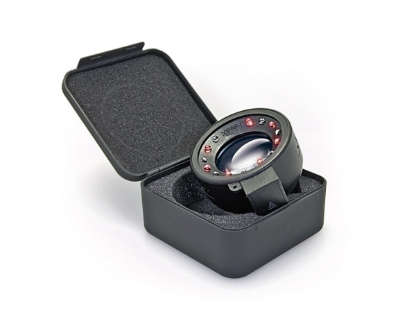 Sensorlupe mit Helligkeitsanpassung. Quasar Speziallupe zur Kontrolle von Sensoren, mit je 7 weissen und roten LEDs zur optimalen Ausleuchtung. 5x Vergrösserung. 67mm Adapterring