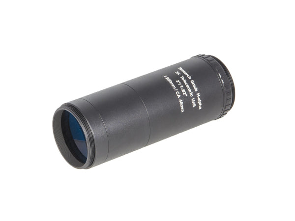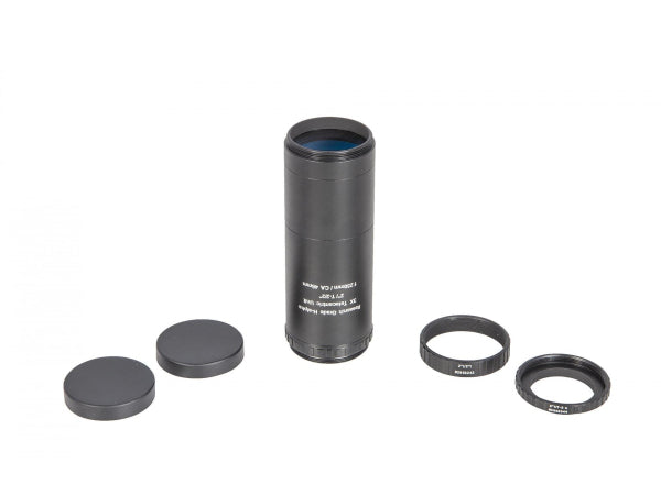Telezentrik mit einer großzügig dimensionierten Eintrittsöffnung mit negativer Linsengruppe, beidseitig mit 2" (50,8mm) Gewinden - inkl. T-2 Adapter und 2" i/a Umkehrring im Standard-Lieferumfang ; 46mm freie Öffnung im Anschluss an das H-alpha Filter, somit auch geeignet für SolarSpectrum Research Grade Filter ; Extra langer Arbeitsabstand von 250 mm für optimierte Brennweiten reduzierung mit Telekompressoren oder für binokulare Beobachtung ; Aplanatisch, mit 3-facher Brennweitenverlängerung und frei von Bildfeldwölbung - liefert f/30 an Teleskopen mit f/10 ; Speziell gerechnet und hergestellt für die H-alpha Wellenlänge, mit 99% Strehl (99% Definitionshelligkeit bei 656,3 nm) in Abhängigkeit vom verwendeten Teleskopsystem ; Auch bei Calcium-K (396nm) liefert es noch beugungsbegrenzte Abbildung mit ca. 80% Strehl
