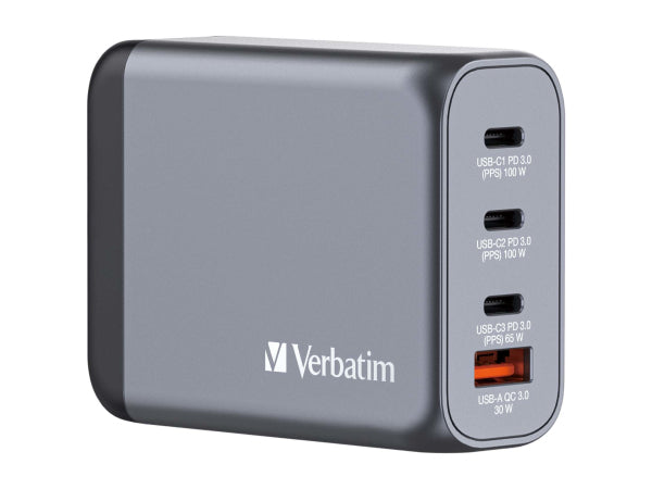 Das 100-W-GaN-Ladegerät von Verbatim vereint mehrere Ladegeräte in einem einzigen Gerät: zwei USB-C PD 100-W-Anschlüsse, einen USB-C PD 65-W-Anschluss und einen USB-A QC 3.0 (EU/UK/US)-Anschluss gemeinsam in einem schlanken, gerade handtellergroßen Design. Dieses Ladegerät ist damit ideal zum Laden von Laptops, Tablets, Smartphones, Spielkonsolen usw. im Büro, zu Hause oder unterwegs. Mit ausklappbaren US-Stiften und austauschbaren EU- und UK-Steckern ist dieses Ladegerät der perfekte Reisebegleiter. Die Galliumnitrat- (GaN-)Technik sorgt für schnelles, effizientes Laden mit hoher Leistung bei geringerer Wärmeentwicklung. Da GaN-Ladegeräte kleiner und leichter als herkömmliche Ladegeräte auf Silikon-Basis sind, sind sie extrem einfach zu transportieren und ideal für unterwegs. Das GaN-Ladegerät wird aus qualitativ hochwertigen, nicht entflammbaren Materialien hergestellt und ist mit vier Schutzsystemen ausgestattet: Überstromschutz, Überspannungsschutz, Kurzschlussschutz und Übertemperaturschutz. So sind Sie beim Laden sicher. - Plastikfreie Verpackung - PPS-Technologie (Programmable Power Supply, Programmierbare Stromversorgung) liefert genau die zum Laden optimale Strommenge - Unterstützt extrem schnelles Laden mit USB Power Delivery 3.0, PPS und Quick Charge 3.0 - Mit 2 x USB-C® PD 3.0 bis zu 100 W, 1 x USB-C PD 3.0 65 W und 1 x USB-A QC 3.0 bis zu 30 W - Hervorragender Reisebegleiter durch ausklappbare US-Stifte und austauschbare EU- und UK-Stecker sowie schlankes, kompaktes Design - GaN-Technologie sorgt für effizientes Laden und eine geringere Wärmeerzeugung - Aus qualitativ hochwertigen, nicht entflammbaren Materialien hergestellt und mit vier Schutzsystemen ausgestattet: Überstromschutz, Überspannungsschutz, Kurzschlussschutz und Übertemperaturschutz - 4-in-1-Laden mit 100 W