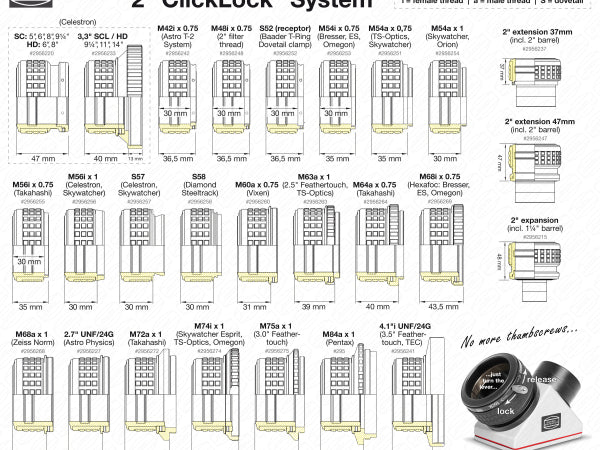 Baader 2" ClickLock M64a Klemme (Takahashi); Baader 2" ClickLock M64a Klemme - passend für alle kleinen Refraktor- Okularauszüge von Takahashi mit M64 x 0.75 Innengewinde, z.B. TAK Sky 9. Am Auszugsrohr dieser Fokussierer befindet sich herstellerseits ein M64 Innengewinde. Das M64 Außengewinde an der ClickLock-Klemme lässt sich abschrauben und gibt darunter ein drehbares M68-Außengewinde frei; Eine 20° Drehung durch Druck auf den Drehhebel reicht aus um alles 2" Zubehör absolut sicher und fest zu fixieren. Bauhöhe: 40mm, Eigengewicht: 190g ; Ratschenfunktion - zeigt akustisch und haptisch die Position der Klemmung an. So erkennt man auch im dunklen und ohne hinsehen ob die Klemme geöffnet oder geschlossen ist ; Kompressions-Spannring aus dickwandiger Hartbronze, bleibt auch nach langjährigem Gebrauch formstabil und hält teuerstes Zubehör absolut sicher ohne Kratzer und Druckstellen zu verursachen