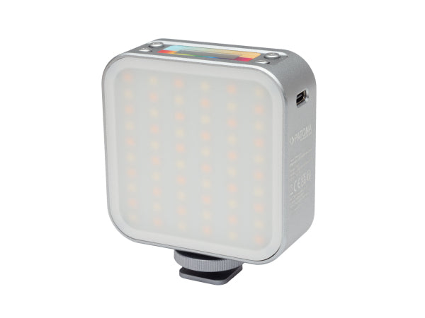 Farbtemperatur und den Akkustand optisch anzeigt. Die Farbtemperatur kann zwischen 2500K und 9000K eingestellt werden, um mehr Umgebungsbedingungen zu erfüllen. Die doppelseitig angebrachten LEDs bieten auf der einen Seite das volle RGB-Spektrum und auf der anderen Seite kühles oder warmes Licht. Main Features: Highlight: wärmeleitendes Aluminiumgehäuse aus der Luftfahrt Unerreichte Farbkontrolle: Wählen Sie aus über 36.000 Farben mit einstellbarer Sättigung und einem extrem breiten Farbtemperaturbereich Lichtquelle: doppelseitige LEDs (eine Seite RGB, die andere warmes oder kaltes Licht) 12 Szenemodi: Mit den 12 integrierten Lichteffektszenen können Sie jede Situation meistern Technische Daten: Anzahl der LED: 36 RGB-LEDs und 30 Bi-Color-LEDs mit kühler und warmer Farbe Maximale Leistung: 5W Farbtemperaturbereich: 2500K bis 9000K Farbwiedergabeindex: CRI ?96 Anzeigemodus: LCD-Anzeige mit blauer Hintergrundbeleuchtung Anzeigeinhalt: Helligkeitsstufe, Farbtemperatur, Akkustand Akku-Typ: Li-Ion Akkukapazität: 2500mAh/25Wh/3,7V (bis zu 3 Stunden Betriebsdauer bei maximaler Leistung) Arbeitsumgebungstemperatur: 0°C-40°C Eingang: USB-C 5V/1A Lagertemperatur: -10°C-50°C Maximale Luftfeuchtigkeit: 20%-90 % Produktmaße: 78 × 66.5 × 25mm (L x H x T) Gewicht: 140g Lieferumfang: 1x PATONA Premium RGB-Videoleuchte doppelseitig magnetisch 1x PATONA Premium Aufbewahrungstasche 1x USB-A auf USB-C Kabel 1x QR-Code zur Anleitung