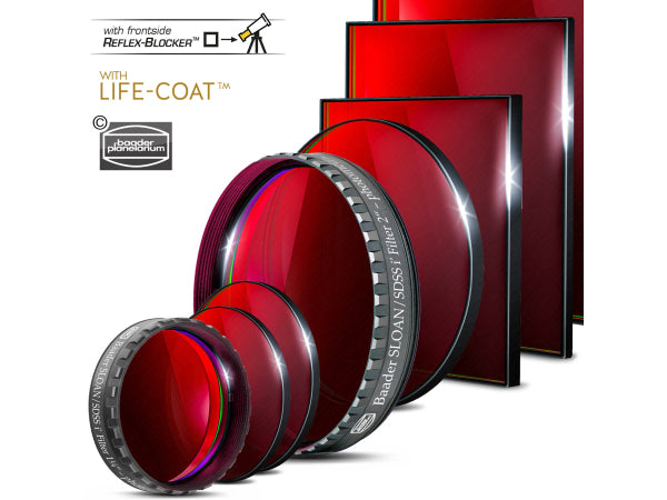 Baader SLOAN-i' Bandpass Filter, geeignet von f/15 bis f/1,8; SLOAN/SDSS (ugriz') photometrischer Filter mit Durchlassbereich gemäß SLOAN-Spezifikation; Hergestellt mit hochmoderner Ionenstrahl Vergütungstechnologie / Daylight-Proof; Reflex-Blocker hartvergütet und planoptisch poliert - mit versiegelten Beschichtungskanten (Life-Coat); Geschwärzte Ränder rundum, mit Filter-Frontseiten-Indikator in Form eines teleskopseitigen schwarzen Außenrandes; Gleichermaßen für moderne CMOS-Kameras sowie für ältere CCD- Kameratechnologien geeignet